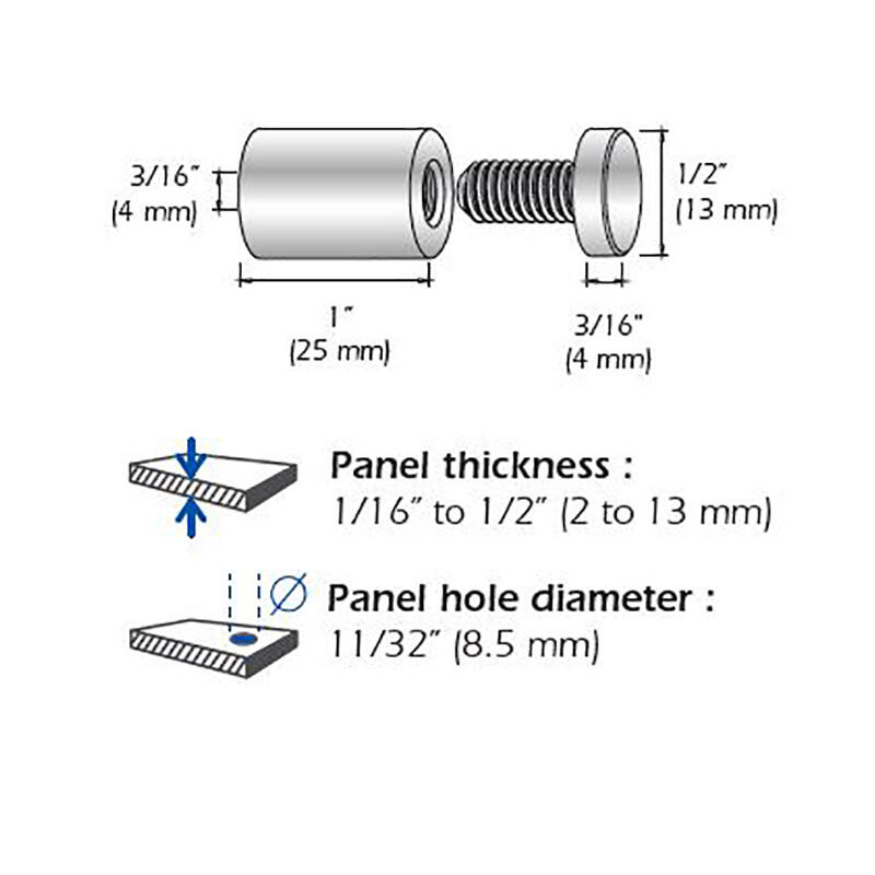 Les Entretoises Murales (Filetées) fournies par Mustang Systems sont fabriquées en aluminium avec une finition anodisé. La fixation murale vissée (entretoise) est livré avec 2 rondelles en silicone et idéale pour fixer un panneau de verre.