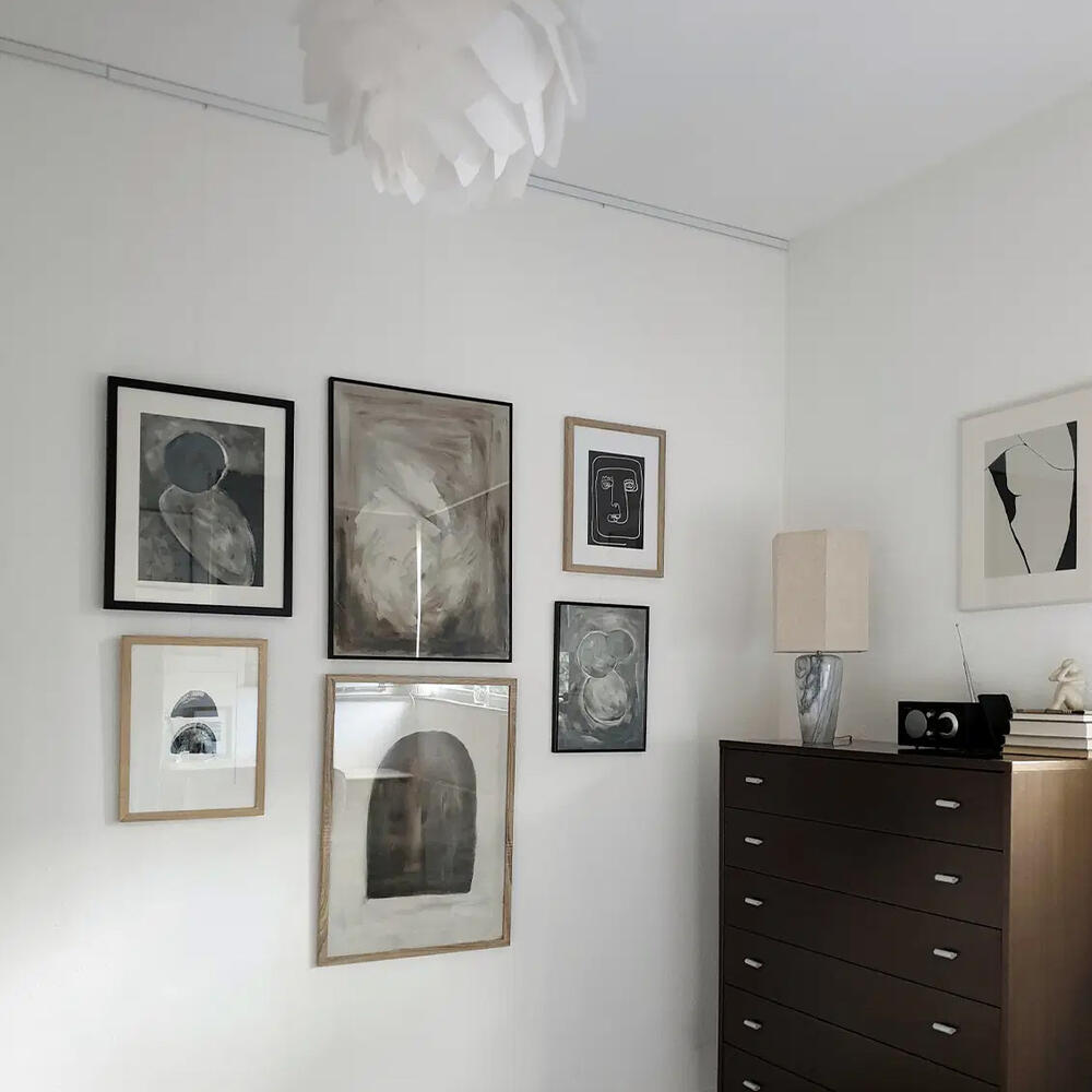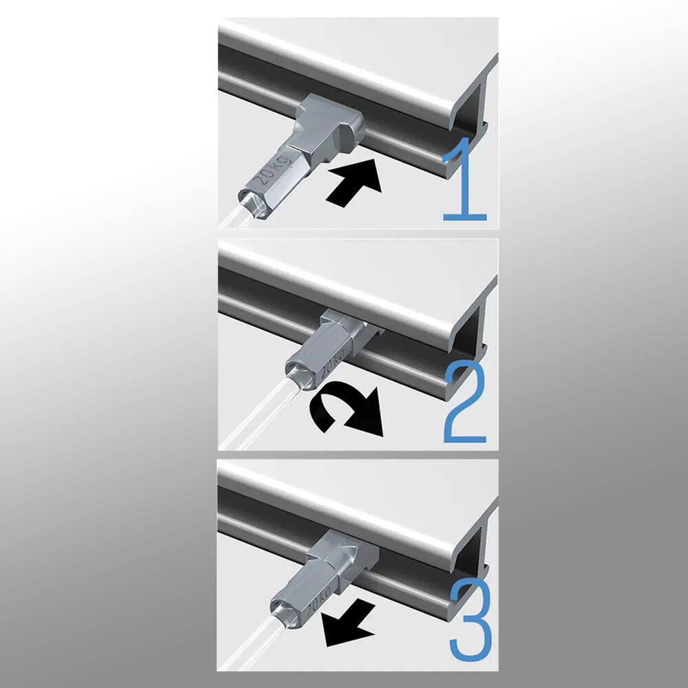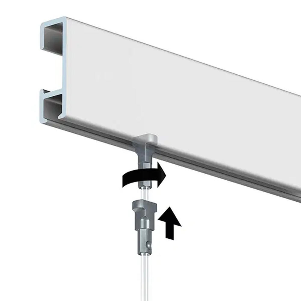 Le système de suspension Twister est compatible avec tous les rails suspendus. Twister propose une méthode simple et intuitive pour fixer le câble au rail : il suffit de tourner, cliquer, et c’est prêt. Grâce à sa capacité à se fixer n'importe où sur le rail, vous pouvez accrocher vos tableaux où bon vous semble sur le mur.