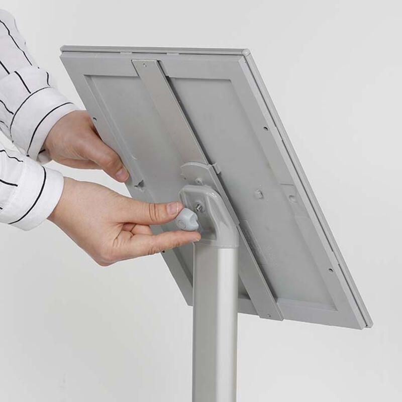 Le Porte Menu Incliné sur Pied fourni par Mustang Systems est idéal pour les salons, expositions ou show-room. Le support est réversible en mode portrait et paysage.